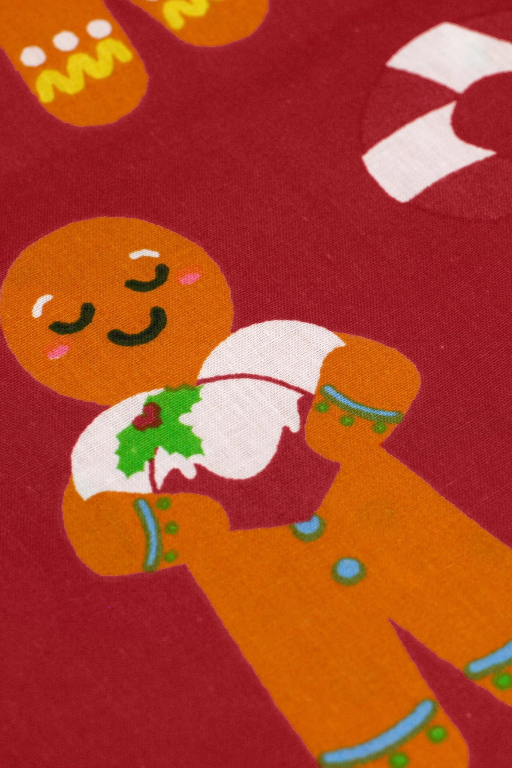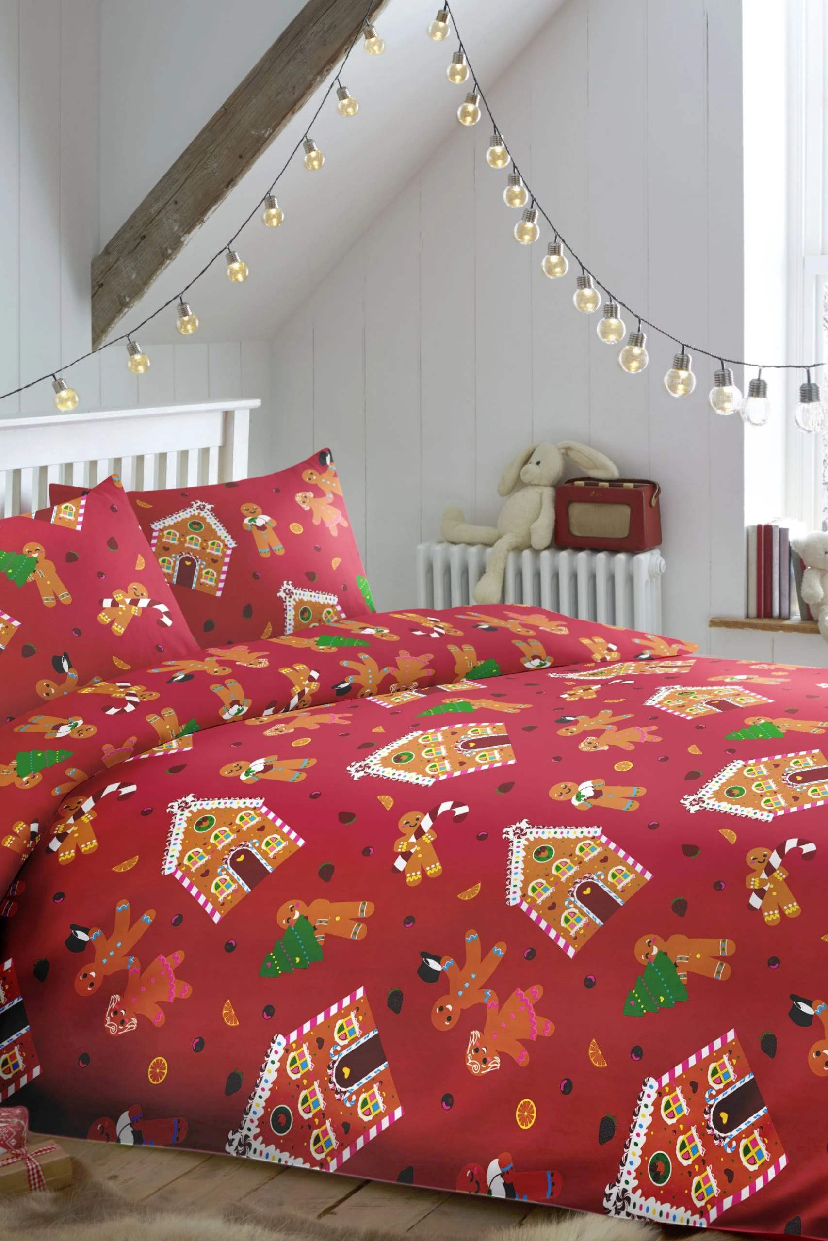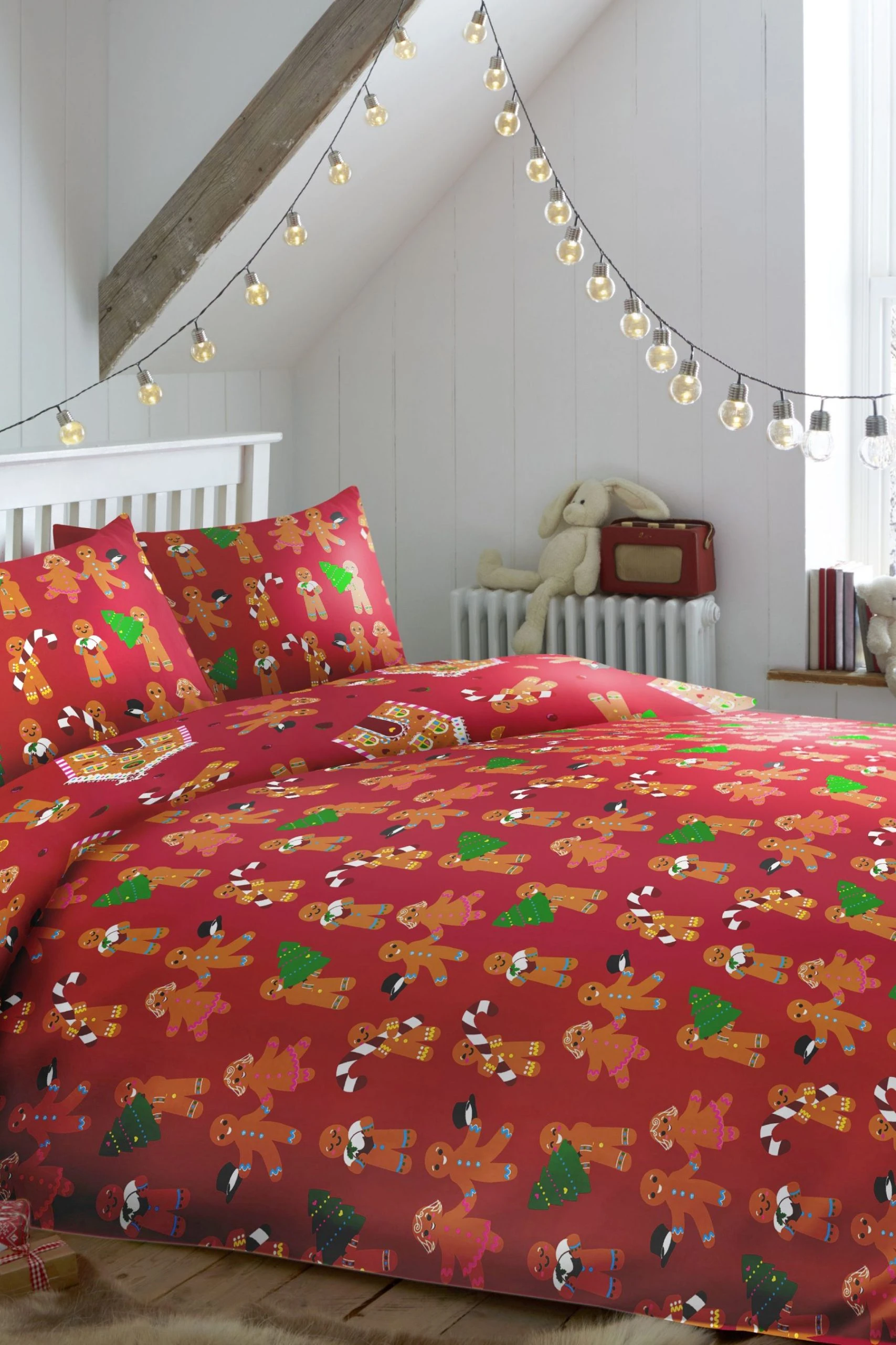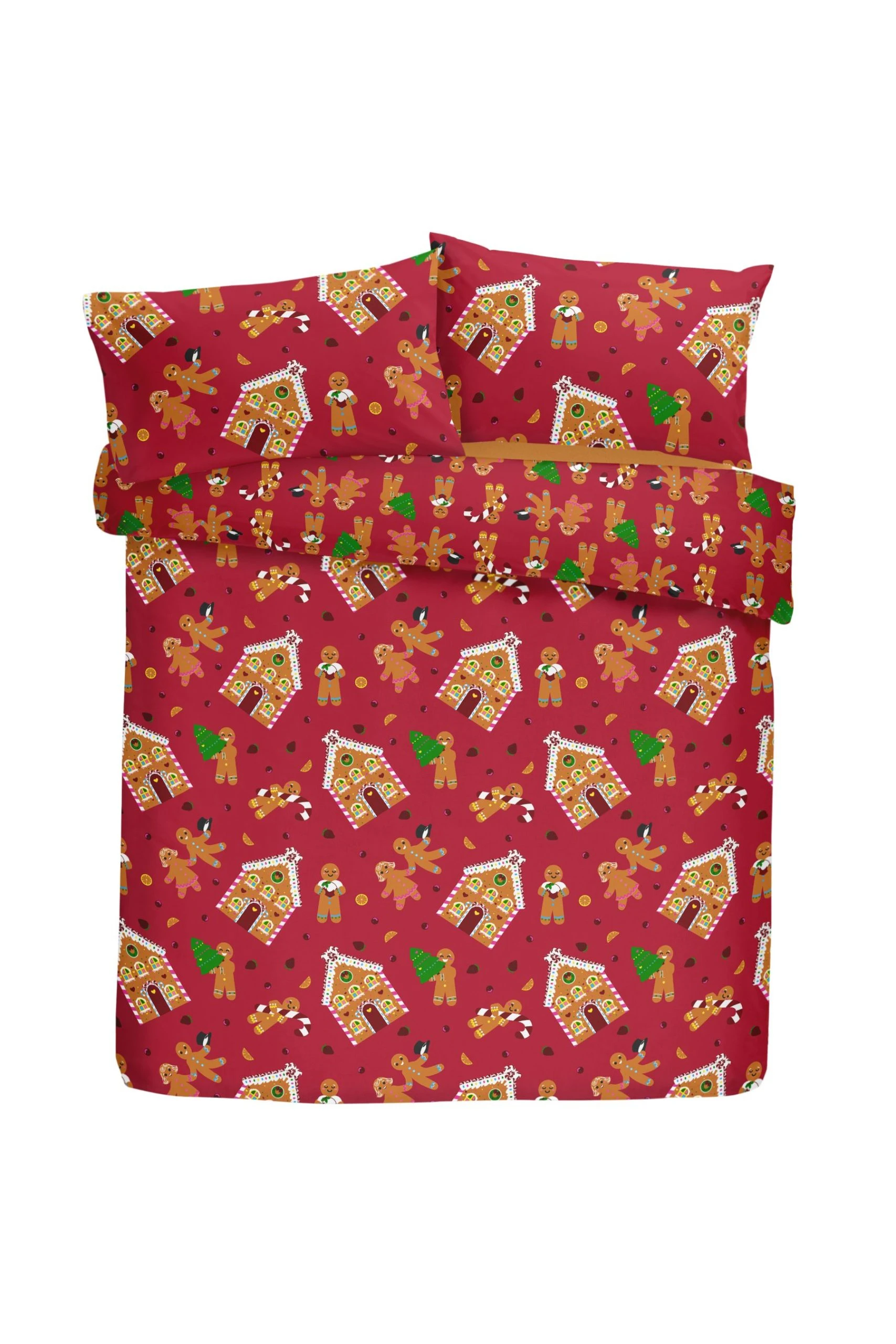 Run, run as fast as you can…. and jump into bed to snuggle down in cosy comfort with this fun and festive jolly gingerbread man design. Lots of festive treats adorn this Christmas fun duvet cover set thats printed on Easy Care poly-cotton red fabric with an alternative gingerbread man & lady design on the reverse. Polycotton fabrics used in this piece mean the duvet cover is very tough wearing and cleans to perfection on a standard machine wash. There is no requirement for heavy weight ironing to arrive back at a smooth looking bedding set. Featuring 1 pillow case for a Single size, and two with Double, King and Super King.