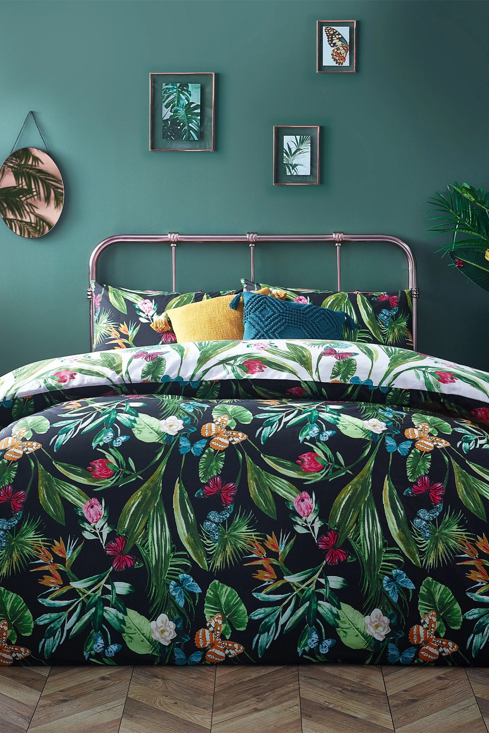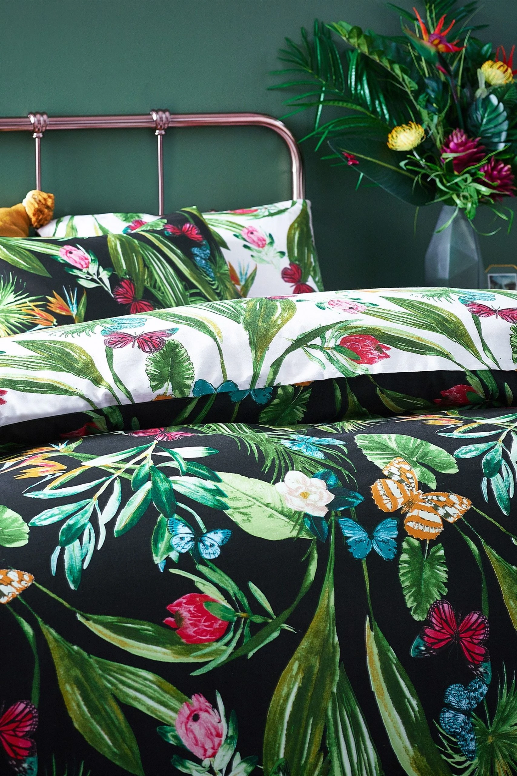 Add a pop of colour to your bedroom with this vibrant botanical duvet cover. The bright butterflies flutter onto the reverse against a neutral base so you can switch the look when you need to.