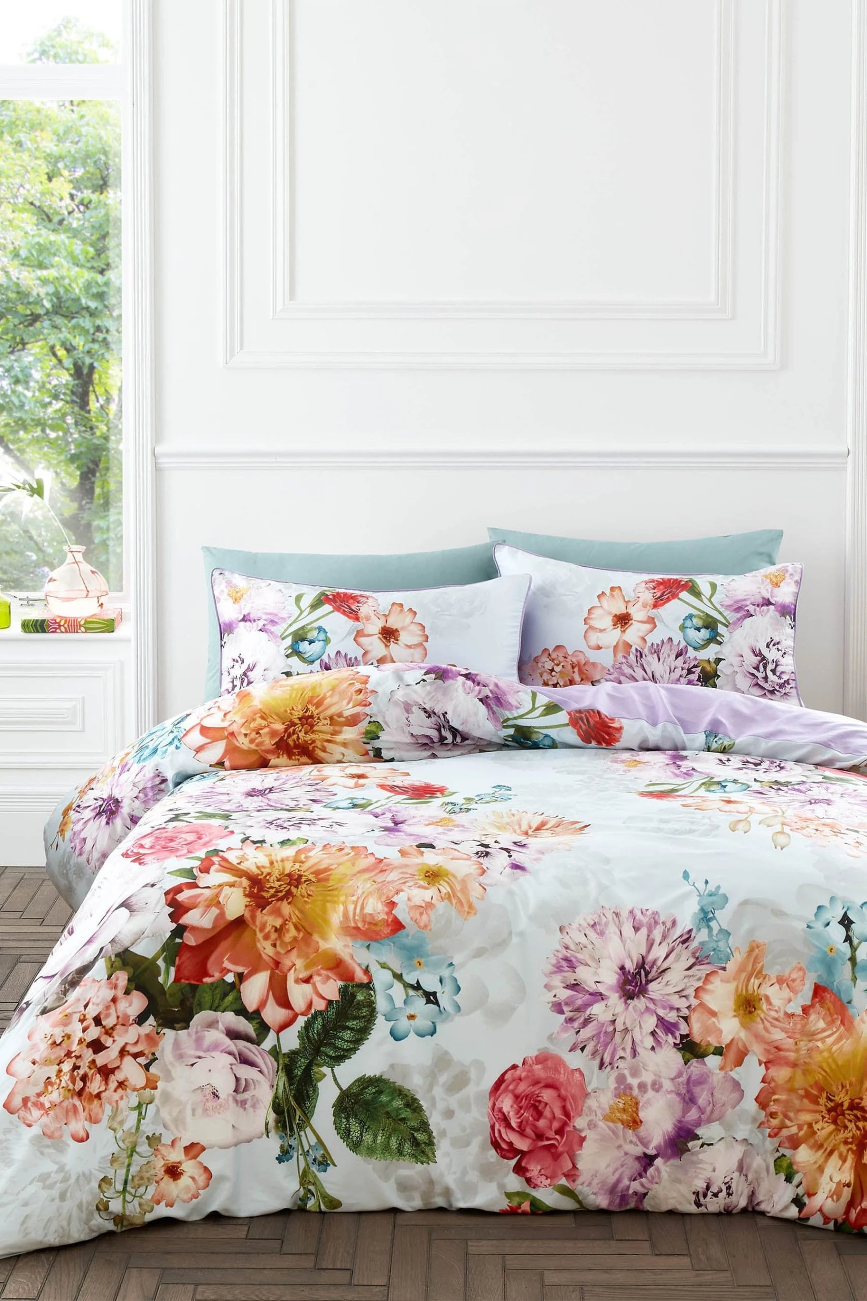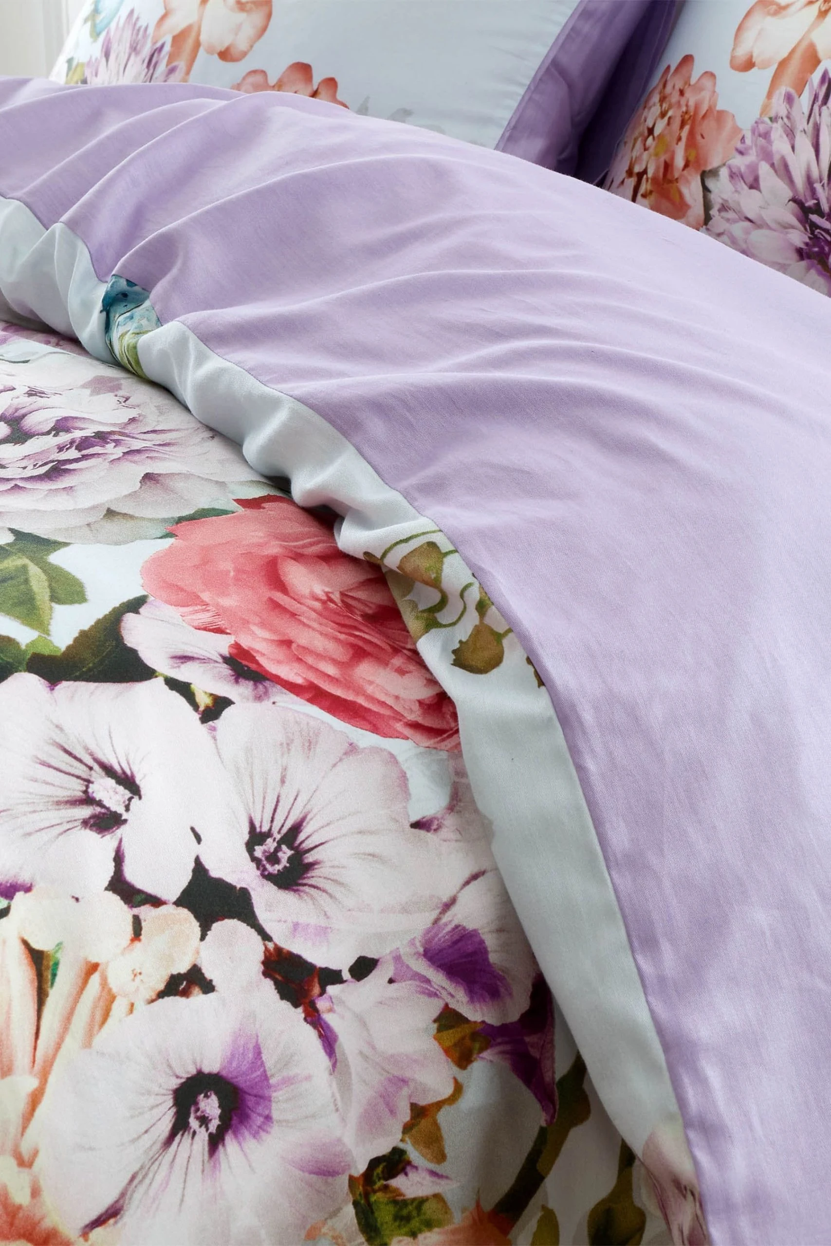 The Hyperion Interiors collection of curtains and cushions has been lovingly curated, bringing together the best designs, innovative techniques and beautiful fabrics that are made to the highest standards ensuring lasting quality and a touch of luxury for years to come. This sumptuously crafted 200 thread count soft touch cotton sateen bedlinen beautifully captures digitally printed florals in bloom complimented by a crisp white backdrop. Accompanied by a plain contrasting lilac reverse for elevated styling options. Ethically sourced overseas and made to quality and human-ecological safety standards, in accordance with STANDARD 100 by OEKO-TEX®. Single size (135x200cm) includes one duvet cover and one pillowcase, double (200x200cm), king (220x230cm), super king (260x220cm) size includes one duvet cover and two pillowcases.