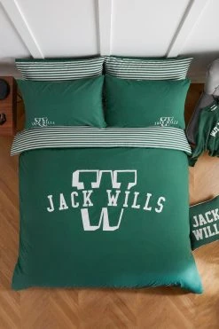 Sleep isn’t the same without premium bedding from your best-loved brand. Make a statement in your bedroom and add that college cool impact for an instantly refreshing update.Inspired by the collegiate aesthetic, this Jack Wills duvet set nods to our signature Varsity collection. Designed with W letter and our logo in a modern font for a bold take on bedding. Plus, this set is reversible with an all-over stripe on the alternate side for versatile style. Crafted in easy-to-iron polycotton in our go-to green shade, you’re guaranteed to be a fan. Available sizes Single Set ,Double Set and King Set . Set includes duvet cover and 2 pillowcases (Includes 1 pillowcase with single set).