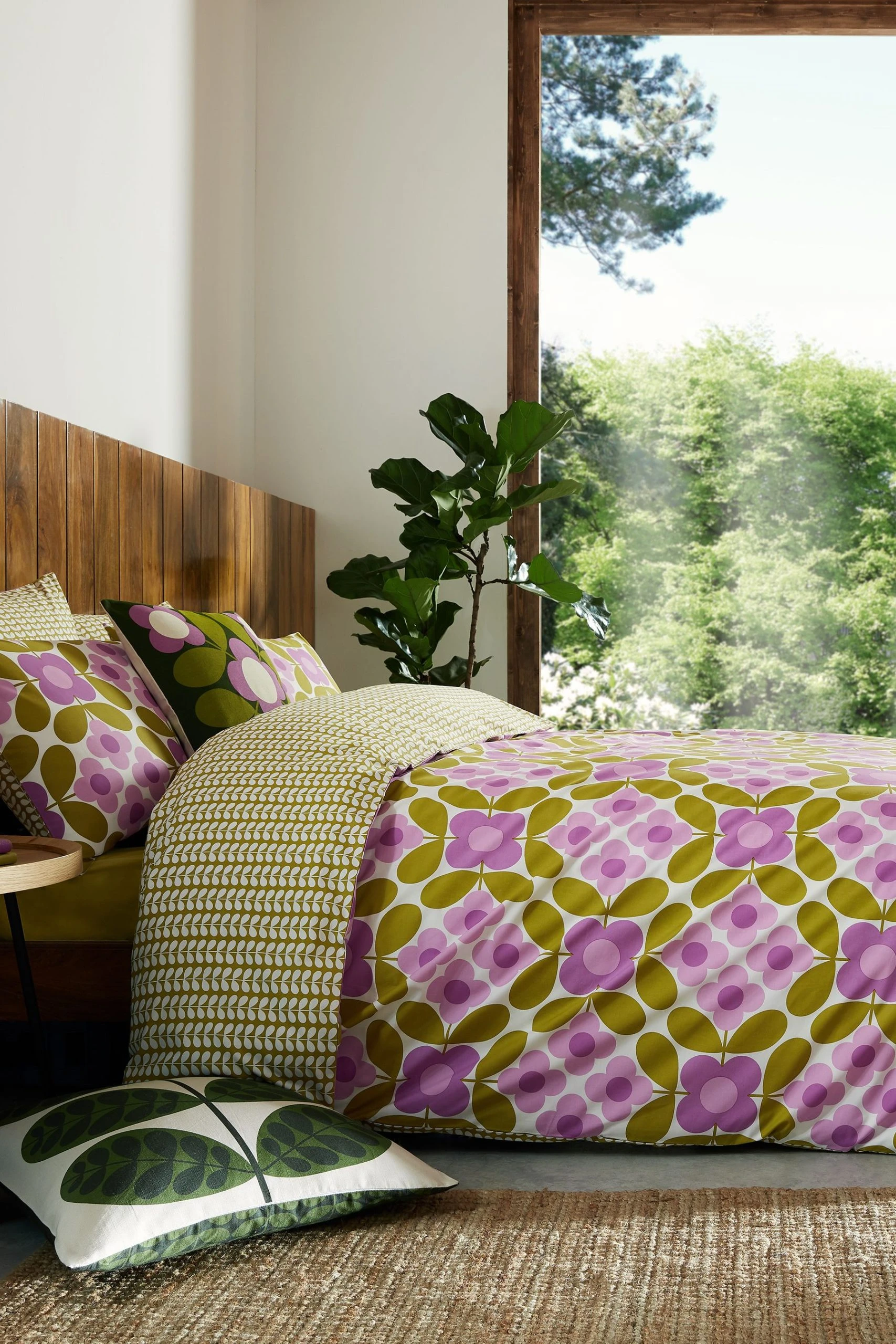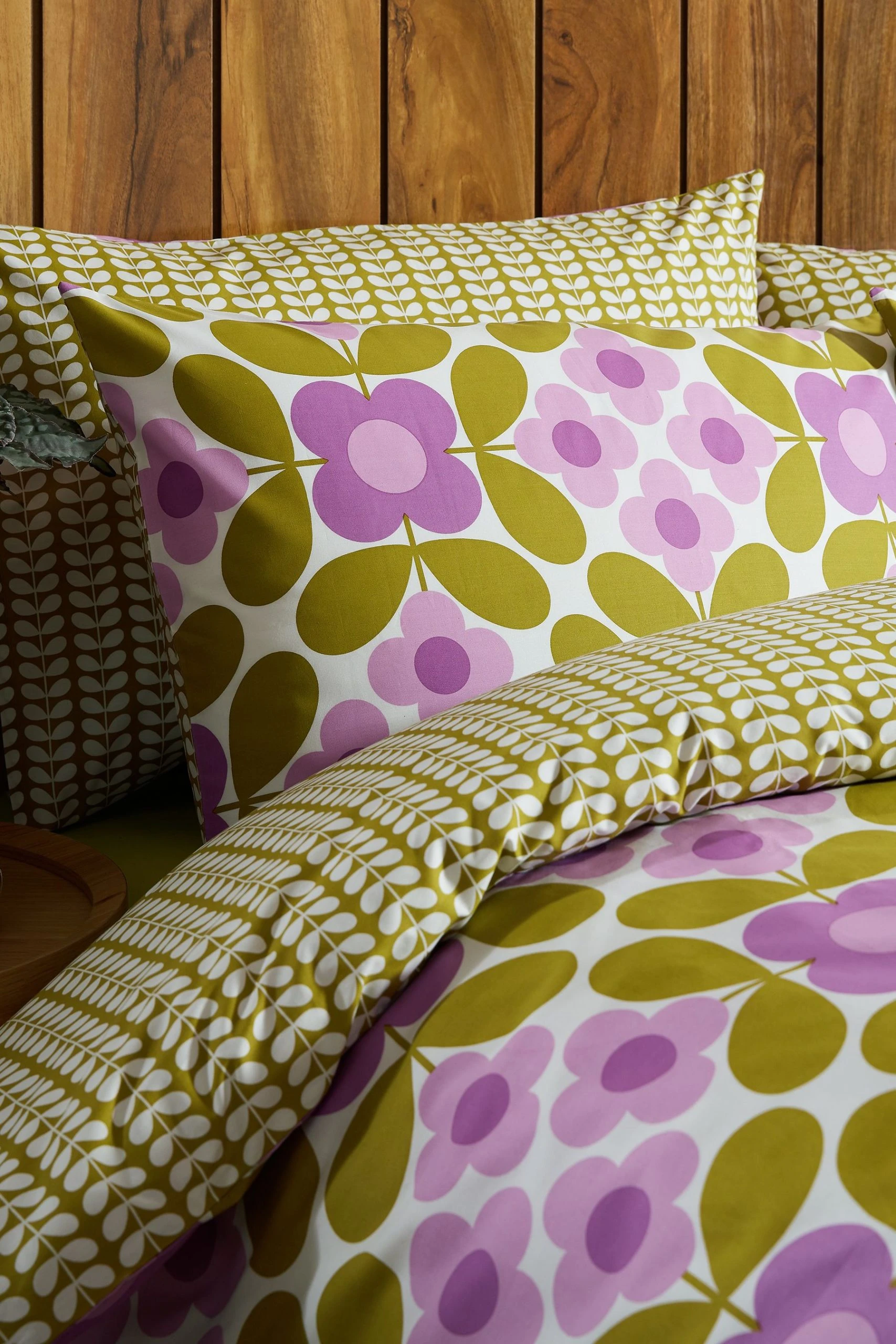 Bring colour to your bedroom with this bright Flower tile bedding. Orla Kiely s iconic four petal flower features in this playful print, inspired by classic Delft tiles and coloured in rich mauve, violet and moss green tones. This reversible bedding features the classic Tiny Stem print on the reverse in a retro moss shade Printed face and reverse. Available in sizes: single set, double set, king set and Super king set. Set includes duvet cover and 2 pillowcases (Includes 1 pillowcase with single set).