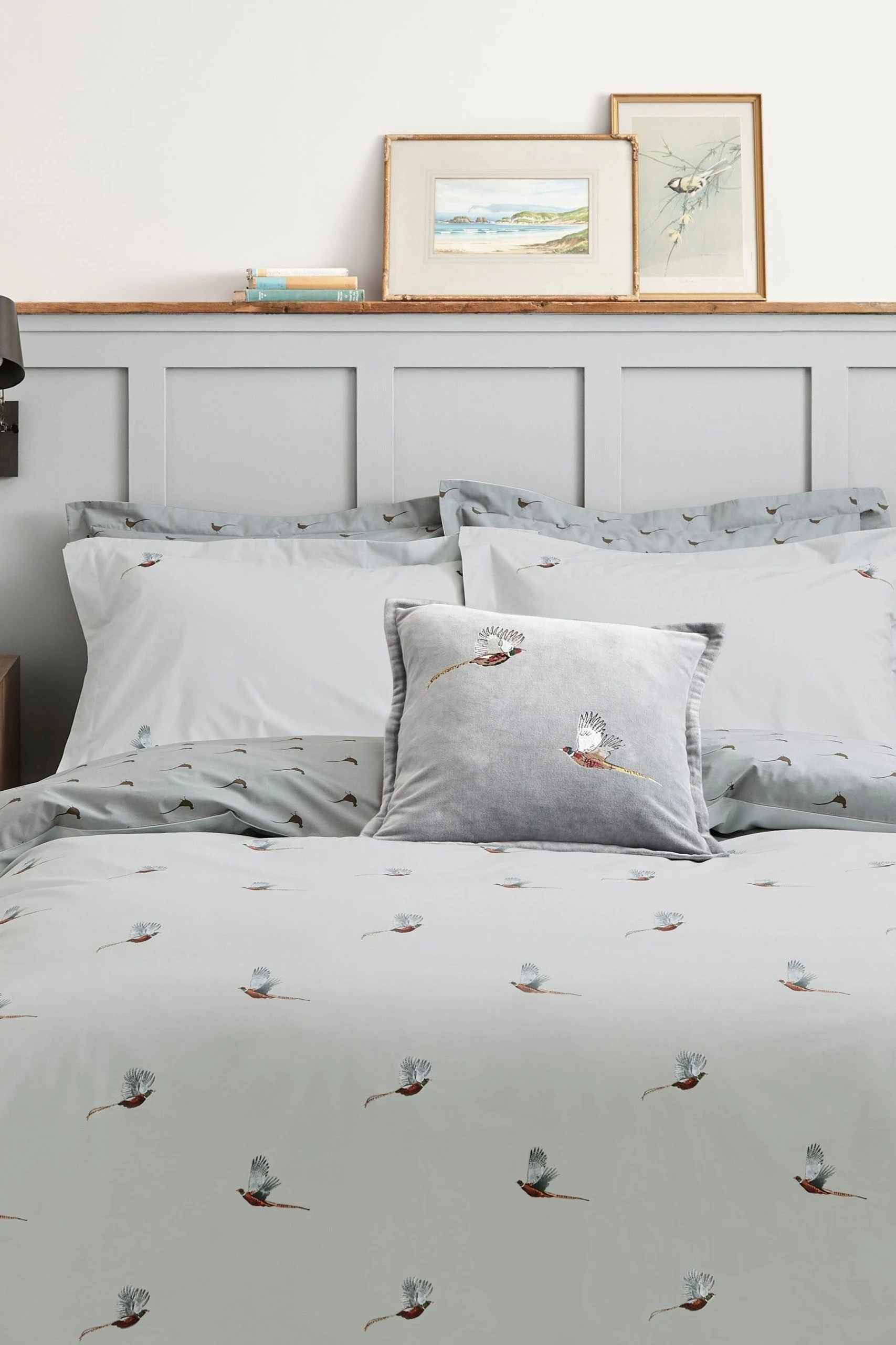 This beautiful bedding set from Sophie Allport features the magnificent long tailed male pheasant gamebird flying across a grey mist background. Presented on 100% cotton with a 200thread count, this subtle country design will coordinate with any home interior. On the reverse, youll find stylish pheasant silhouettes on a stone blue ground.