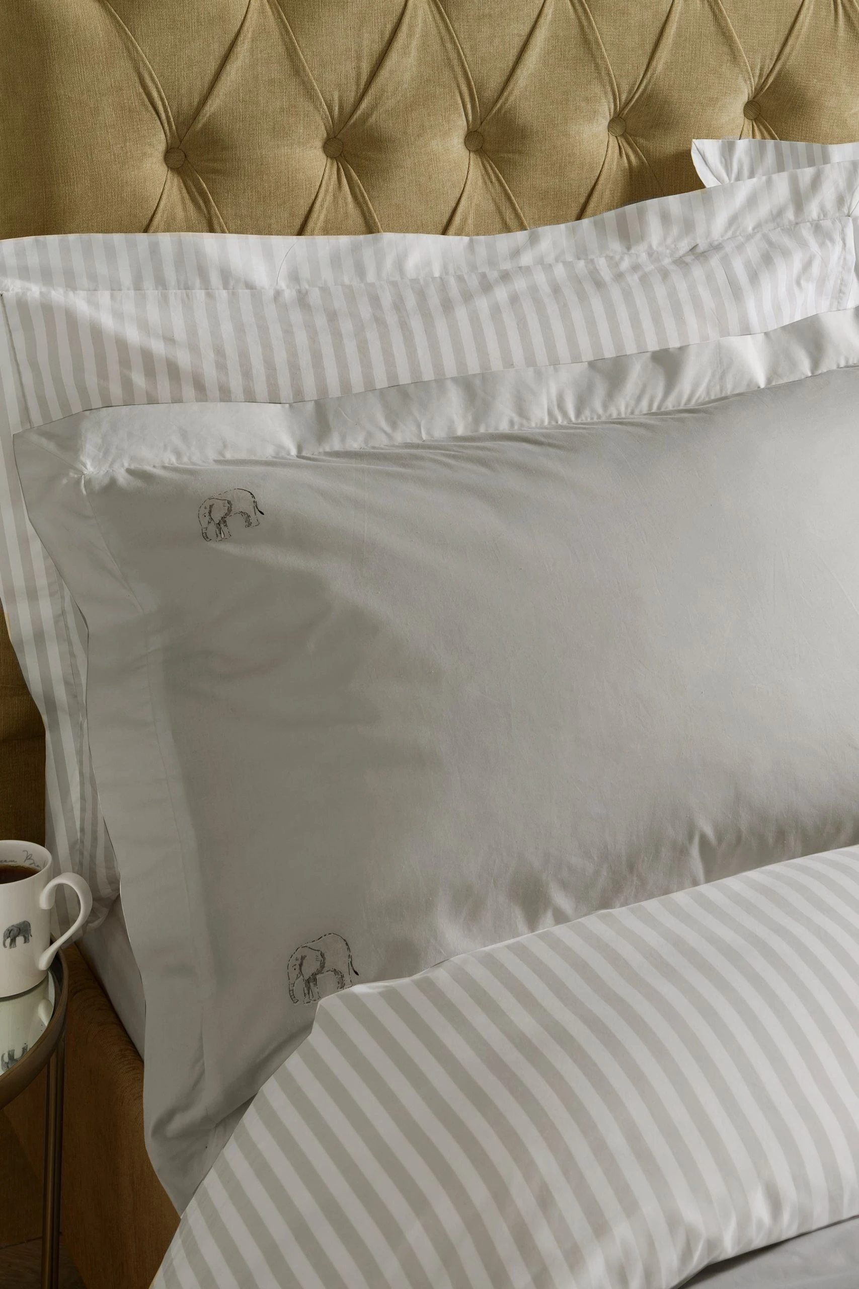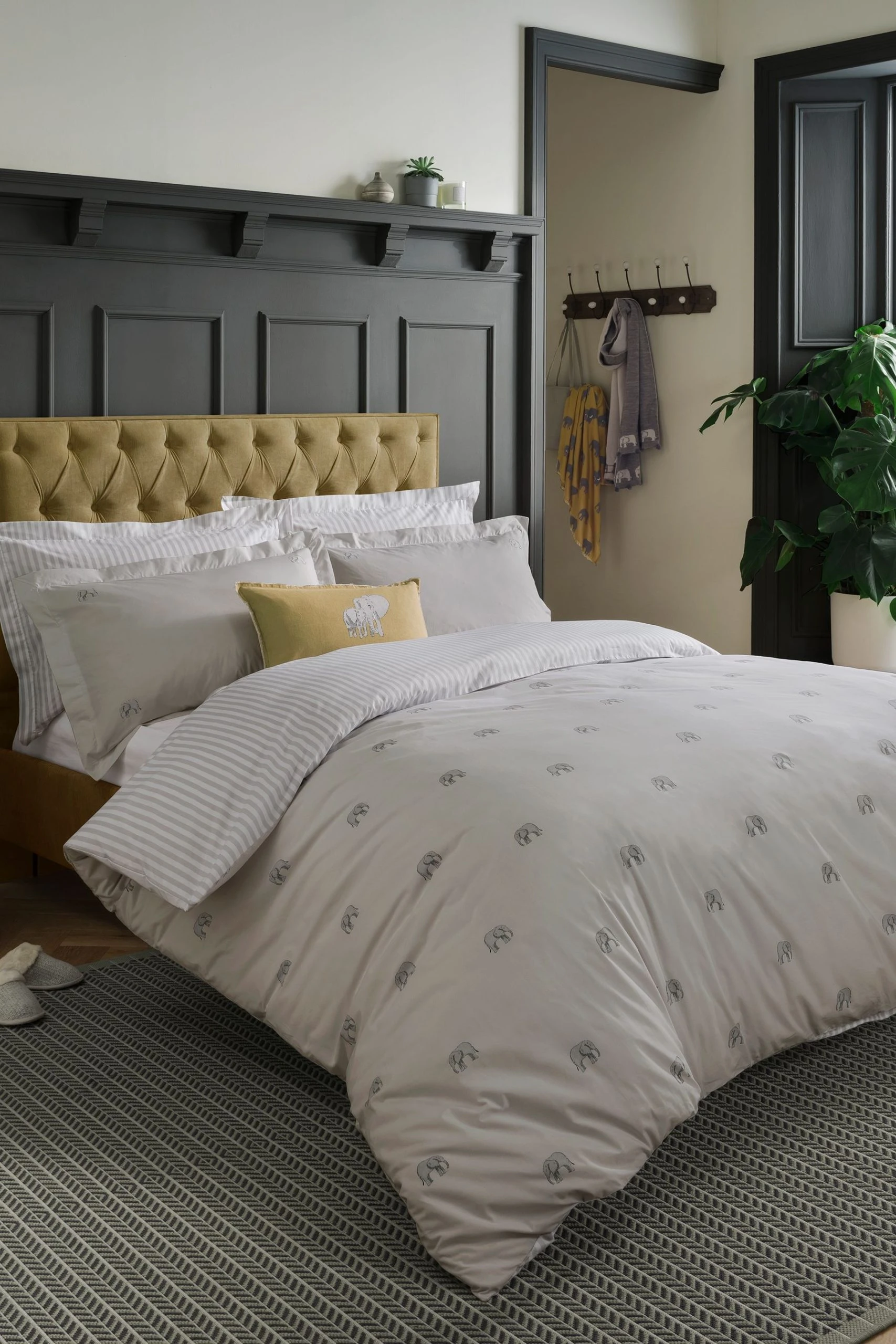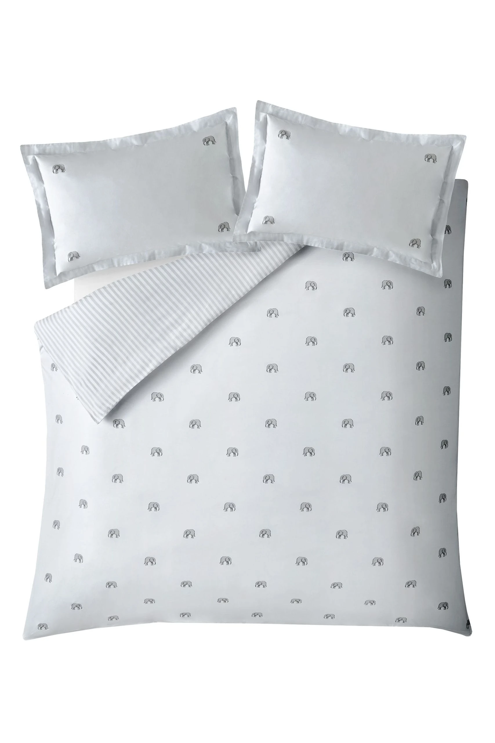 Magnificent gentle giants stroll across a dove grey base in beautiful 200TC cotton quality bedding. By buying this bedding, you will be supporting global conservation charity ZSL and helping them to create a world where wildlife thrives. Elephant admirers and wildlife enthusiasts will love to incorporate this subtle and sophisticated design into their bedroom. The reverse features grey and white stripes, while the Oxford pillowcases have corner elephant detailing. Available in sizes: single set, double set, king set and Super king set. Set includes duvet cover and 2 pillowcases (Includes 1 pillowcase with single set).