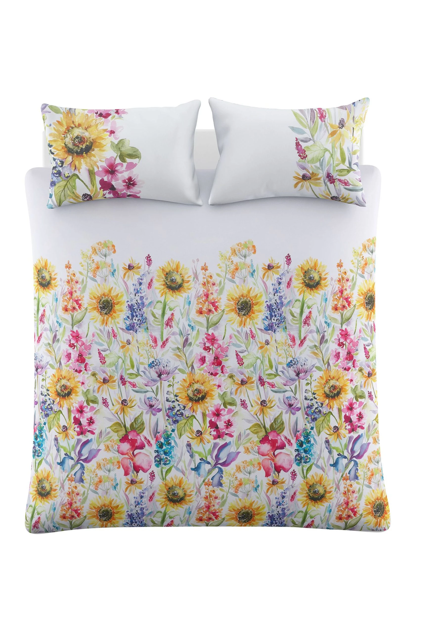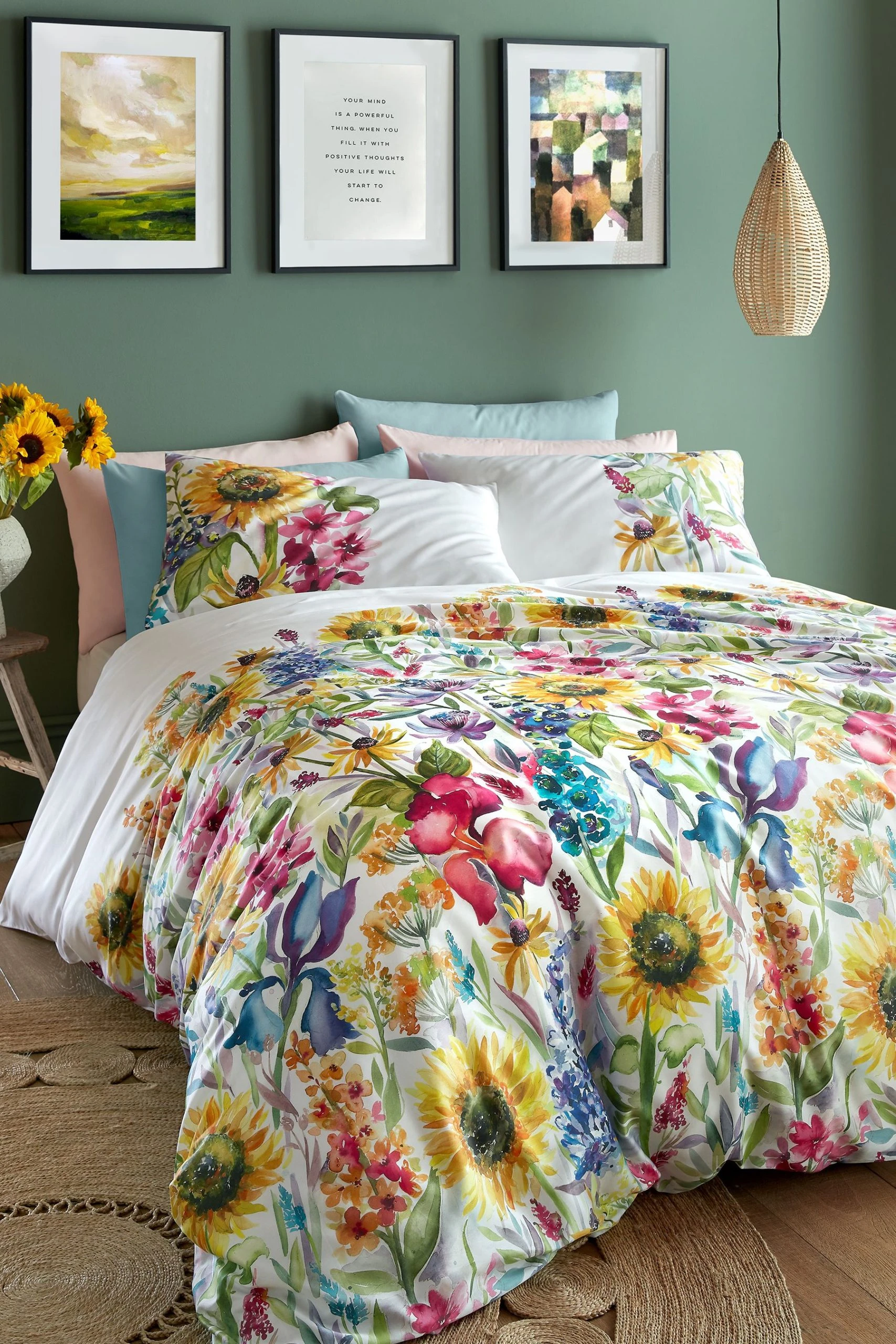 A bright summer floral with beautiful watercolour sunflowers this vibrant design, hand painted in a delightful fresh palette is printed onto a crisp, white 220tc cotton sateen and comes complete with matching pillowcases. Available in sizes: single set, double set, king set and Super king set. Set includes duvet cover and 2 pillowcases (Includes 1 pillowcase with single set).
